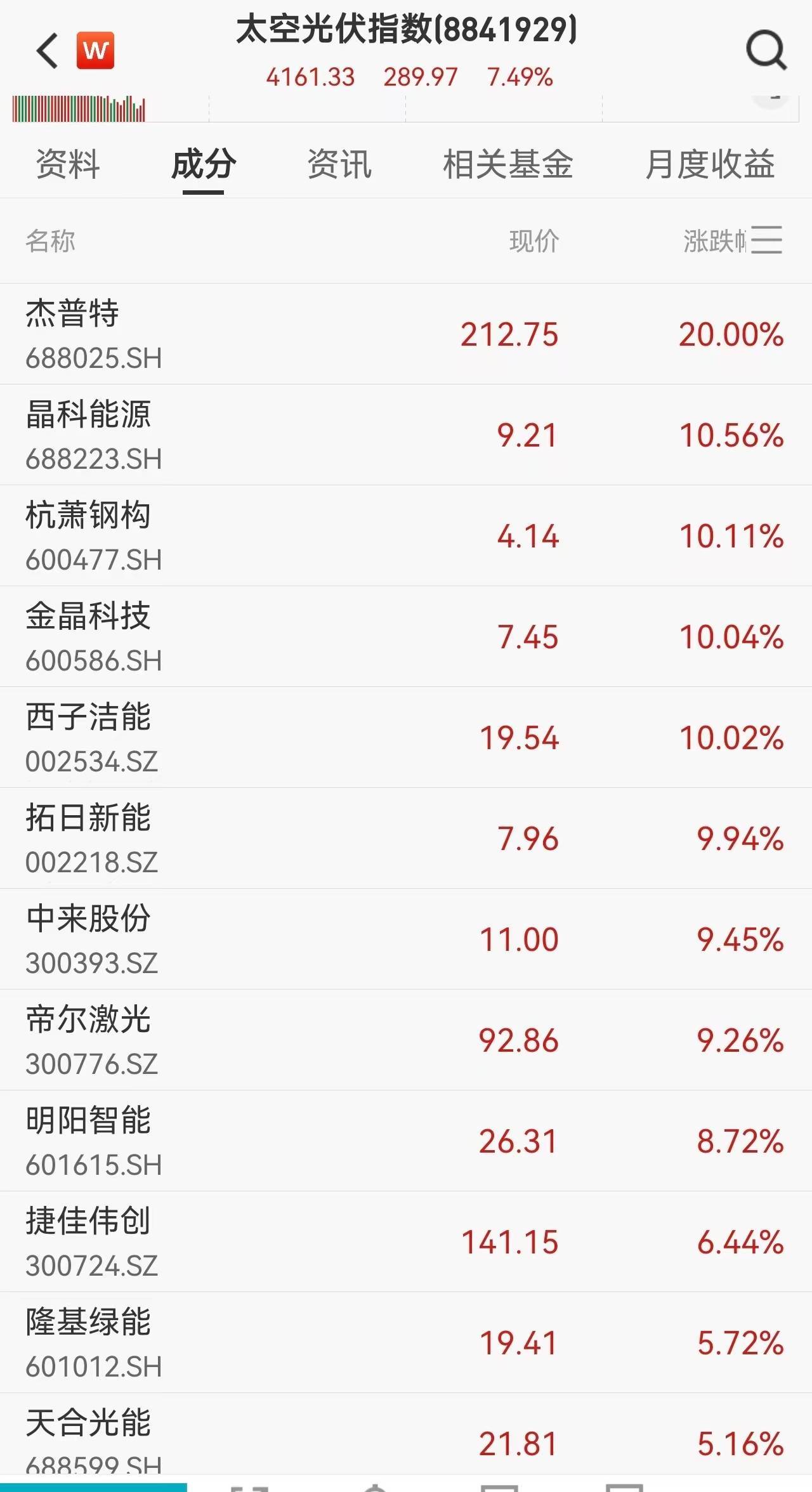 早盘,太空光伏概念股持续走强,协鑫集成4连板,杰普特20CM涨停,晶科能源涨超10%,TCL中环、爱旭股份、双良节能、杭萧钢构、金晶科技、西子洁能、拓日新能等涨停。